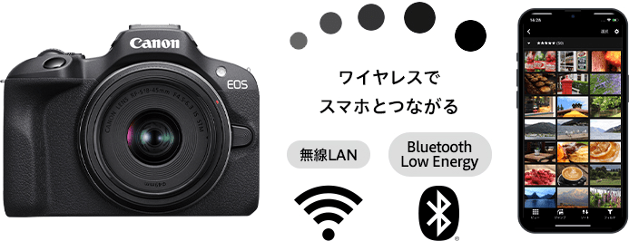 カメラとスマートフォンを常時Bluetooth接続では小さな写真データをカメラに送ったり、Wi-Fiを使えば大きな画像や動画をスマートフォンに送ったりできます。