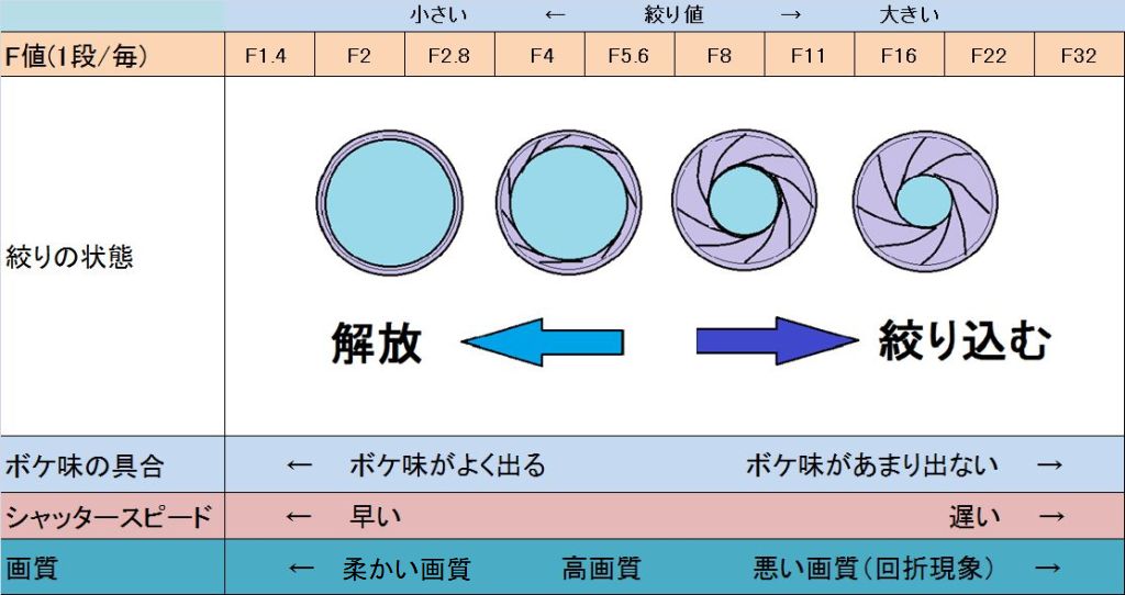 絞り(F値)明るくなる(F値小さい・F2.8など)ボケやすい暗くなる(F値大きい・F11など)ピントの合う範囲が増える