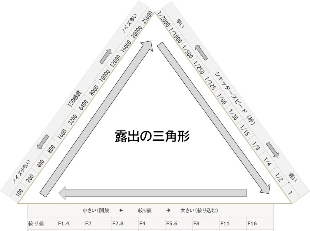 「ISO感度・シャッター速度・絞り(F値)」の関係を図で見ればわかりやすいように露出の三角形図があり露出のバランスがわかりやすくなっています。